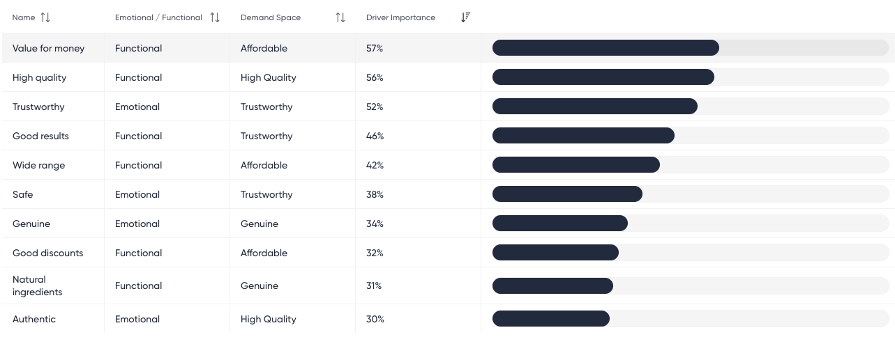 Innovation does play a role, just not at the start. Drivers like youthful, trend-leading, and exciting show small but steady growth, particularly among younger audiences. Brands such as Sol de Janeiro or The Ordinary succeed not because they replace trust and value — but because they add energy once those fundamentals are in place. Innovation works best as a finishing layer, not a foundation.